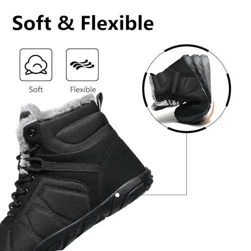 • WIDE TOE BOX: Winter barefoot shoes are designed with a wide toe area that provides ample space for the toes to stretch, effectively dispersing the pressure on the feet and preventing the toes from being squeezed, bringing a more comfortable wearing experience.Even with thick socks in winter, your feet have plenty of space