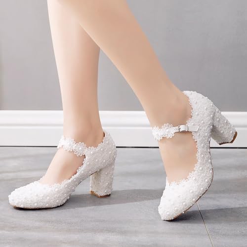 White Bridal Wedding Shoes Closed Toe Dress Pumps 2.75 Inch Chunky Heels Round Toe with Lace Flower Crystal Pearl Stitching Wedding Shoes 6