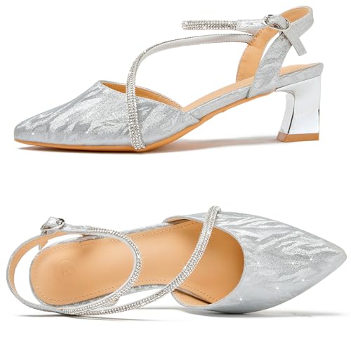 • 【Elegant Slingback Pumps】: Women's pumps with slingback design and Closed pointed toe create the illusion of longer legs. Slip into a relaxed and exquisite state of mind with these pumps. 2.2 inch chunky heels design with rhinestone embellished ankle strap, from jeans to skirts, suits, can easily match all types of clothes in your wardrobe.