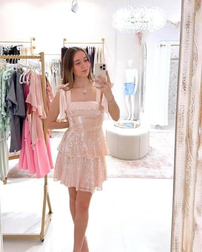 Sparkly Sequin Tiered Homecoming Dresses for Teens Spaghetti Strap A-Line Short Prom Dress Bow Cocktail Party Gowns 6