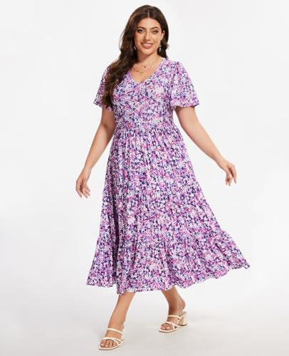 More information about Women's 2025 Plus Size Casual Dress Floral Tiered V-Neck Aline Short Sleeve Summer Maxi Dresses with Pockets
