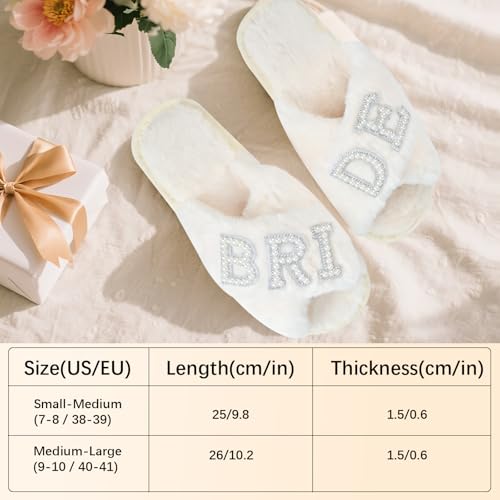 • Fashion Bridal Slippers: White faux fur cross band bride slippers that are print with rhinestones BRIDE letters makes these women slippers stylish and practical. Easily slides in whenever you want your feet relaxed for wedding day.