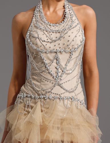 More information about BELLA BARNETT Beige V Neck Sequin Tassel Halter Mesh Dress Rhinestone Maxi Backless Sparkle Prom Dress