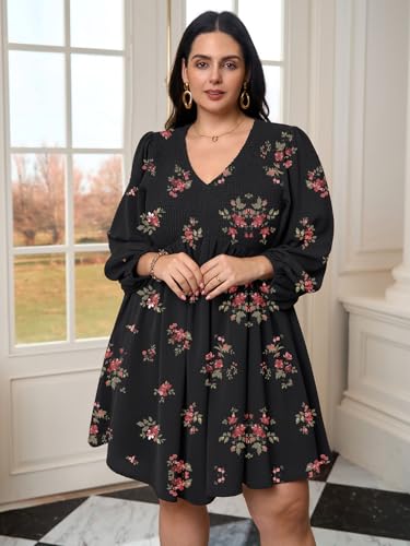 More information about Plus Size Floral Mini Casual Dress with Pockets Long Sleeve V Neck Smocked Flowy Fall Dress for Curvy Women