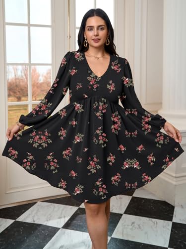 HOT ! Plus Size Floral Mini Casual Dress with Pockets Long Sleeve V Neck Smocked Flowy Fall Dress for Curvy Women