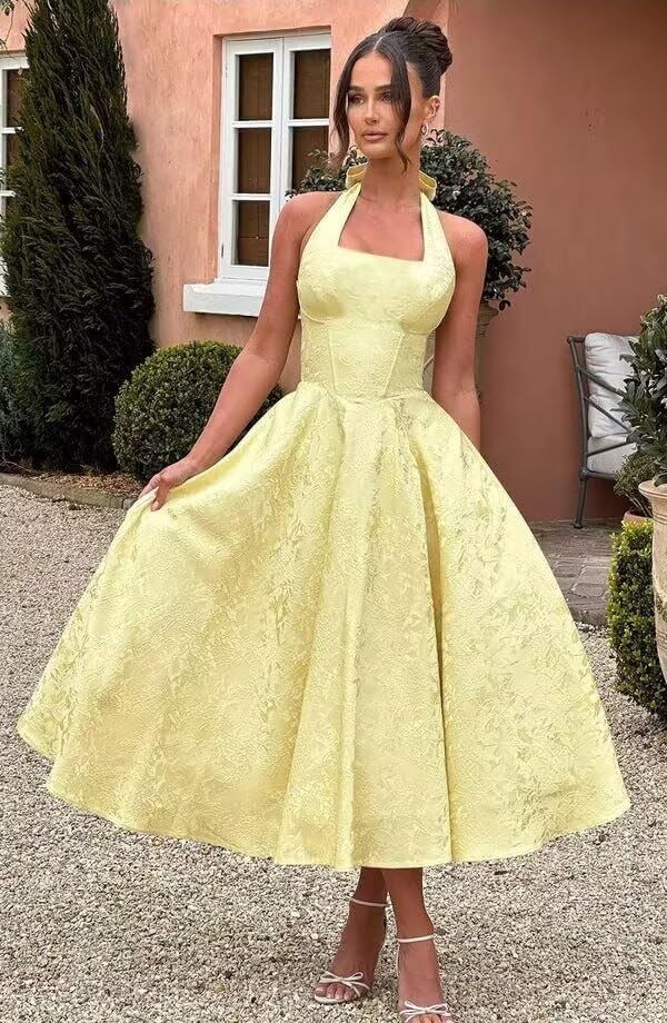 More information about Jacquard Satin Prom Dresses 2025 with Bow A-line Midi Halter Square Neck Formal Party Gowns with Pockets