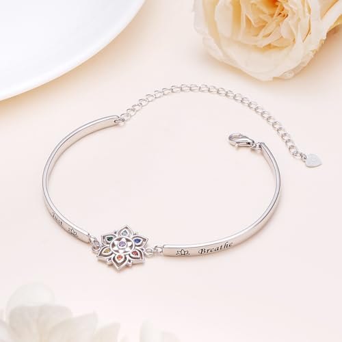 7 Chakra Bracelet 925 Sterling Silver Just Breathe Lotus Flower Rainbow Stones Yoga Chakra Energy Balance Bangle Bracelet Jewelry for Women Spiritual Healing 6