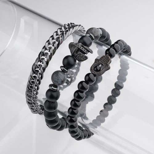 • 3pc Men's Bracelet Set: Our meticulously crafted set includes a stainless steel chain bracelet, a natural stone beaded bracelet, and an adjustable woven bracelet. These bracelets are made with different metal accessories and natural gemstones. You can wear them individually or layer them for a versatile style that exudes masculine charm!