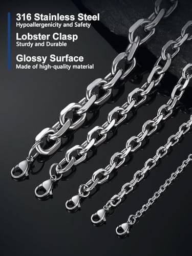 • Multiple Size Specifications: Our stainless teel cable chain includes four widths of 5mm/7mm/9mm/12mm and seven lengths of 18 inches to 30 inches, with sturdy lobster clasps that can easily adjust the length of the mens necklace, making it easy to wear. This silver chains for men can be mixed and stacked with your other chains for a variety of styling choices, almost suitable for everyone's daily wearing needs.