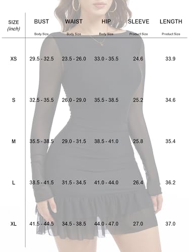• Features: Cute bodycon mini dresses featuring with side ruched sculpting slim fit, classic boat neck and sheer mesh long sleeve, ruffle hem design, this mesh mini dress is your go-to for turning heads,combines modern style with timeless elegance