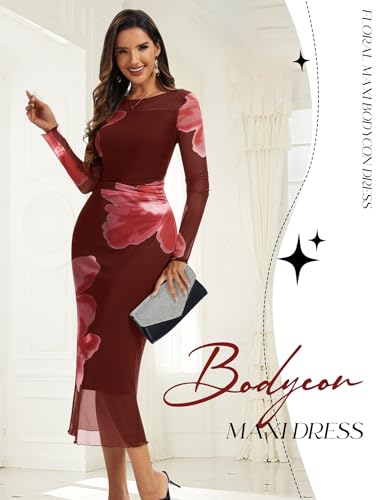 Dressystar Women’s Floral Print Bodycon Maxi Dress 2025 Summer Fall Ruched Long Sleeves Mesh Formal Wedding Guest Dresses 1