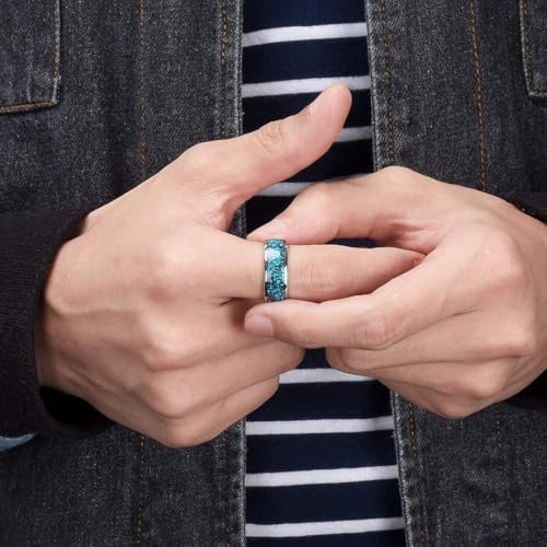 • High Quality Domed Wedding Ring Band for men or women. Beautiful silver and blue turquoise granules inlay tungsten ring is approx. 8MM in width (depending upon size). Note: Inlay is natural so it may vary slightly. Our Tungsten rings are scratch proof and keep their shine. Tungsten is ranked second hardest next to diamond on the Mohs scale, diamond being a 10 followed by Tungsten carbide as 9. Hypoallergenic. Tungsten is high quality, will not or turn your fingers green and does not cause irritation on the skin. Due to the Hardness of Tungsten carbide, Tungsten rings may be laser engraved, but CANNOT be engraved by hand. They CANNOT be stretched. Men's Wedding ring bands Silver & Blue.