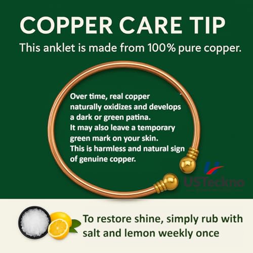 • ✅ PREMIUM PURE COPPER BUILD: Handcrafted in India from 100% solid high-gauge copper with polished brass ends. This durable, chemical-free, and non-magnetic anklet offers lasting wear and a timeless look.