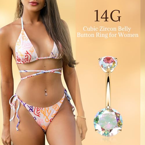 • 14G Belly Button Ring: Bar thickness:14 G( 1.6 mm); Bar length: 8 mm; Top CZ size: 5 mm; Bottom CZ size: 8 mm; Color: gold; CZ color:AB color; Common belly piercing size for women and men