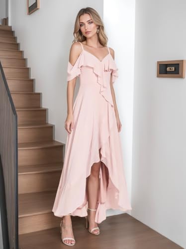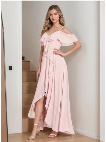 More information about Cold Shoulder Bridesmaid Dresses for Women 2024 Chiffon Ruffle A-Line Hi-Lo Formal Evening Gowns V-Neck Open Back