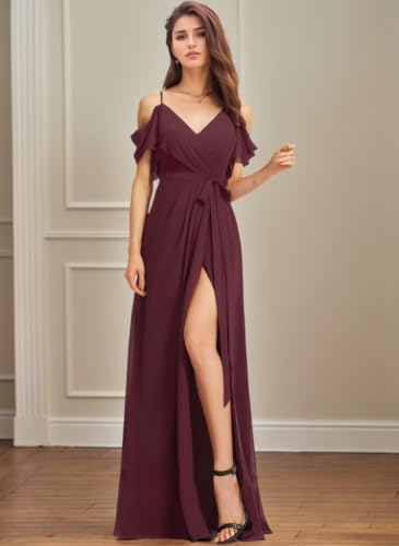 • Design: Off the Shoulder Bridesmad Dress for Women, Flutter Chiffon Formal Dress,Cold Shoulder,V-neck,High Slit,Side Split,Spaghetti Straps,A Line,Pleated,Sleeveless,Corset Lace Up Back,Floor Length,with Belt.