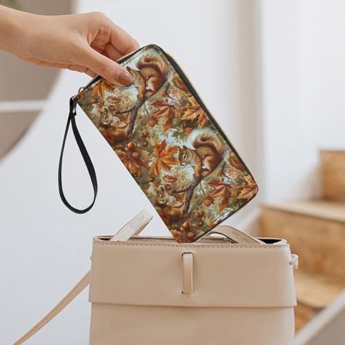 HOT ! Fall Squirrel Women's Wallet Wristlet Zipper Purse with Hand Strap Travel Credit Card Holder for Daily Use Gifts