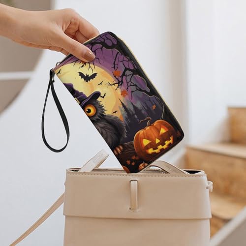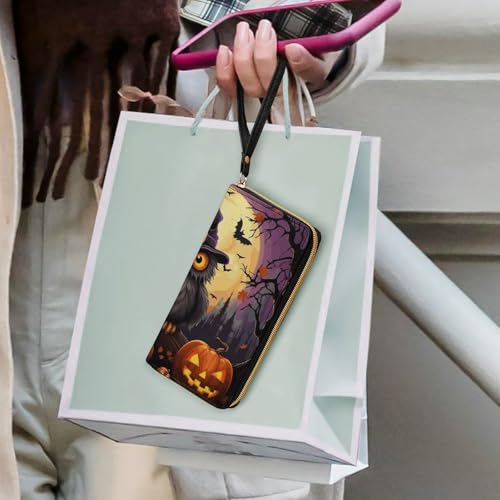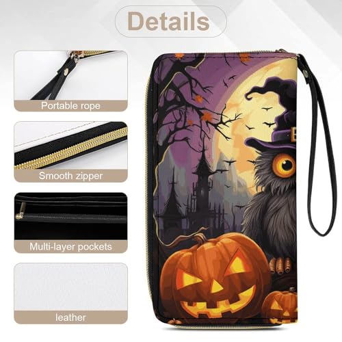 HOT ! Halloween Owl Ghost Pumpkin Leather Wallet Smooth Zip Around Clutch Wristlet Travel Long Soft Purse for Women