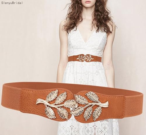 Women's Vintage Wide Elastic Stretch Adjustable Waist Belts with Metal Leaves Retro Cinch Belt Navy Blue One Size 1