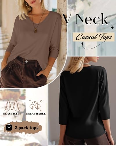 Huukeay 3 Pack Women's 3/4 Sleeve T-Shirts, V Neck Casual Tops Loose Fit Tunic Basic Tees 3/4 Length Sleeve Soft Blouses 5