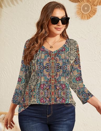 Romanstii Plus Size Tops for Women Womens 2025 Summer 3/4 Sleeve Blouses Dressy Casual V-Neck T-Shirts Pleated Tunic XL-5XL 5