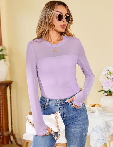 HOT ! Totatuit Women Mesh Top Sexy Long Sleeve with Thumb Hole Sheer Shirt Crew Neck Double Lined Fitted Top Side Ruched Shirt