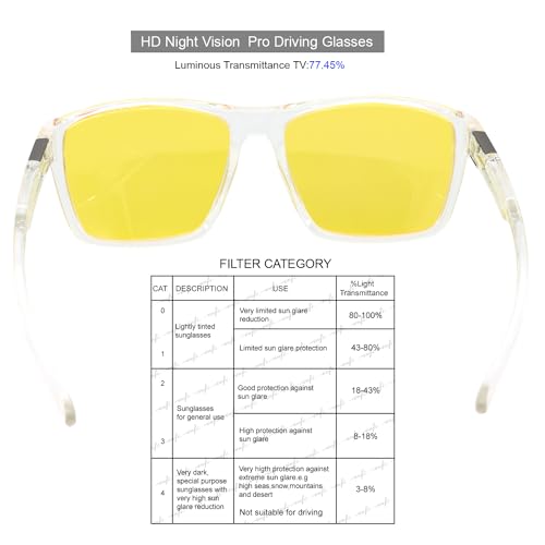 • Polarized yellow lenses provide higher clarity at night, reducing glare from car lights and improving nighttime driving performance
