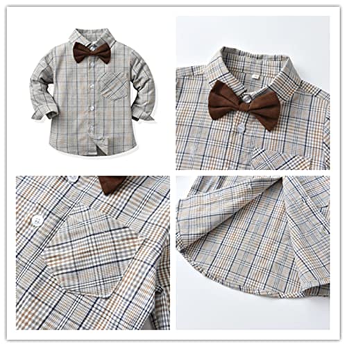 Kids Boys Formal Suspender Outfits sets,Long Sleeve Bowtie Plaid Shirts + Suspender Pants Wedding outfits 3
