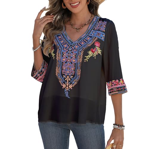 Mexican Embroidered Tops for Women Boho Chic Short Sleeve V Neck Blouse 3/4 Sleeve Floral Casual Summer T-Shirt 3