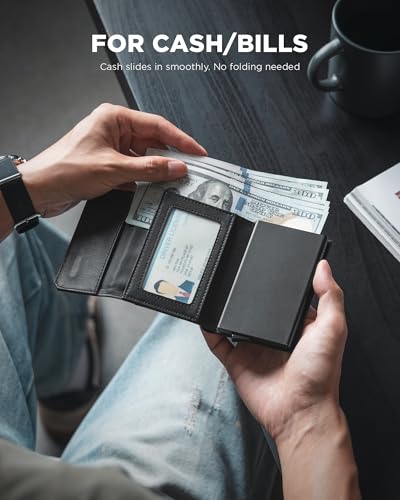 • STORAGE CAPACITY - Holds up to 10 cards total - 6 in aluminium chamber, 4 in leather cover, including an ID window and a quick-access card slot at the logo side for 1-2 frequently used cards. The dedicated cash slot easily accommodates 10+ bills or cash