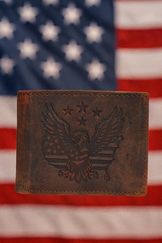 HOT ! Men’s RFID Blocking Vintage Leather Patriotic Eagle & USA Flag Debossed Bifold Wallet (Brown)
