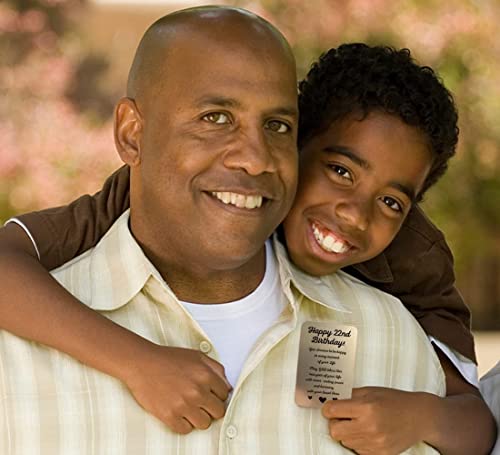 • ✔️ HIGH QUALITY. Light, durable and long-lasting aluminum 22nd birthday card for her or him. The engraved words of the wallet inserts, the keepsake for a long time