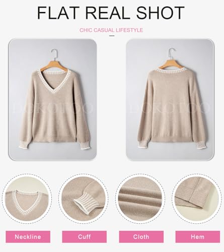 HOT ! Dokotoo Womens Sweaters Casual V Neck Long Sleeve Contrast Knit Pullover Sweater Solid Fall Outfits Tops