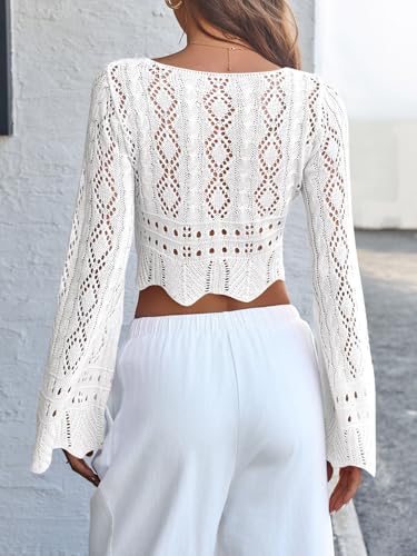 Saodimallsu Womens Crochet Crop Tops Tie Front Bell Long Sleeve Cardigan V Neck Lightweight Knit Shrug Sweaters 4