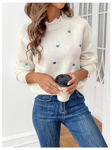 GORGLITTER Women's Heart Lace Cute Fall Pullover Sweater 2025 Long Sleeve Trendy Knitwear Valentine Sweater Jumper 2