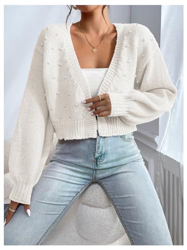 HOT ! SHENHE Women's Pearl Beaded Open Front V Neck Drop Shoulder Cropped Cardigan Sweater