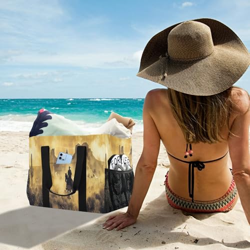 YETTASBIN Vintage Cowboy Large Foldable Travel Tote Bag, Lightweight Waterproof Swim Pool Bag with Handles & Pocket for Beach Outdoor, Reusable Grocery Bag for Kitchen, Shopping 6