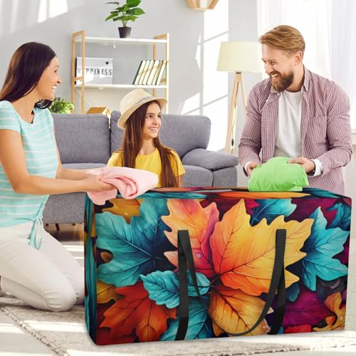 HOT ! Watercolor Maple Leaves Extra Large Moving Bags Heavy Duty Storage Bags Colorful Leaves Cloth Wrap Around Handles Double Zipper Reusable Convenient Foldable Storage Tote for Travel Camping Space Save