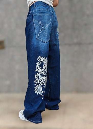 HOT ! Unisex Y2K Hip-Hop Gothic Jeans Casual Baggy Oversize Streetwear Gragon Print Letter Graphic Retro Denim Pants