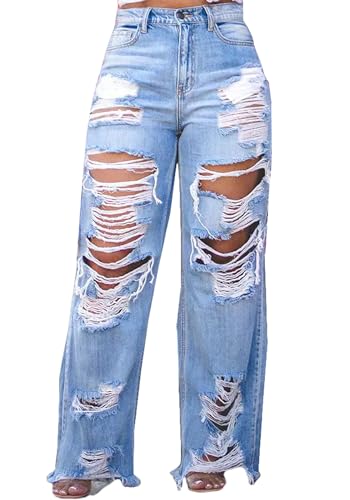 HOT ! SHINFY Women's Ripped Jeans Distressed Cutout High Waisted Baggy Straight Wide Leg Y2K Denim Pants