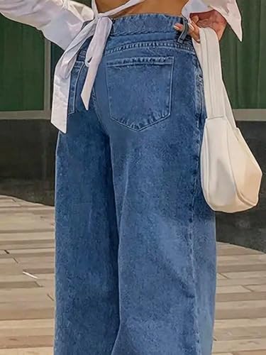 Straight Leg Jeans for Women Casual Washed Vintage Wide Fit Boyfriend Baggy Low Waisted Denim Pants with Snap-Button 5