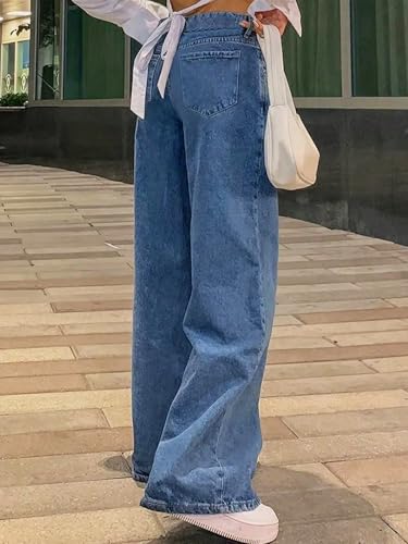 More information about Straight Leg Jeans for Women Casual Washed Vintage Wide Fit Boyfriend Baggy Low Waisted Denim Pants with Snap-Button