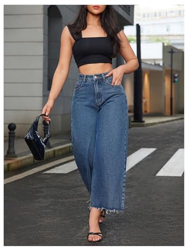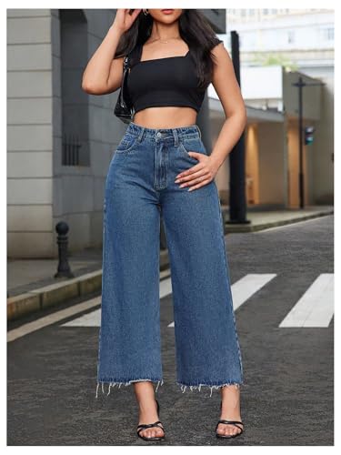 HOT ! Floerns Women's High Waist Raw Hem Denim Pants Wide Leg Jeans with Pockets