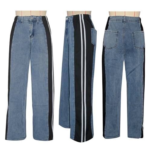 More information about YOOTIKO Women High Waisted Jeans Patchwork Striped Pants Straight Wide Leg Denim Jeans Streetwear