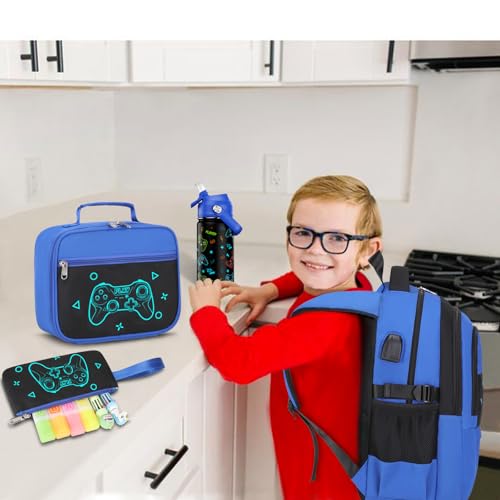 HOT ! Boys Backpack with Lunch Bag Pencil Case, 14oz Insulated Bottle, BPA-FREE Double Tumbler 18/8 Stainless Steel Leak Proof Cups with Metal Straw for School Boy (Blue Game Console)