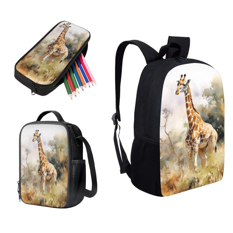 HOT ! Watercolor Giraffe 17inch School Backpack for Students 3D Realistic Giraffe 3-in-1 Kids School Bag with Lunch Box Pencil Case Grassland Animal Primary Junior Bookbag