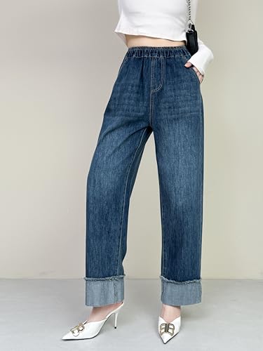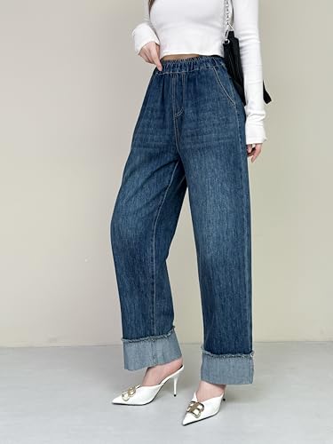 HOT ! Womens Wide Leg Pants Baggy Jeans Straight High Waisted Fold Hem Denim Pants with Pockets Elastic Waist Pants (US, Alpha, Medium, Regular, Regular, A)