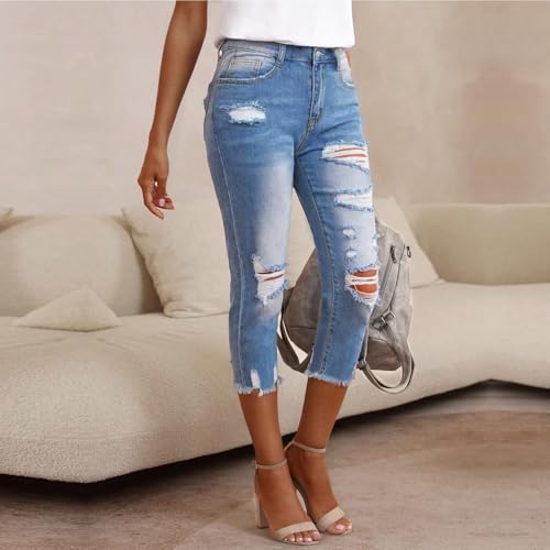 HOT ! fanmpghleoo Capri Jeans for Women Stretch Frayed Hem Ripped Jeans Lightweight Denim Capris with Pockets Summer Denim Joggers