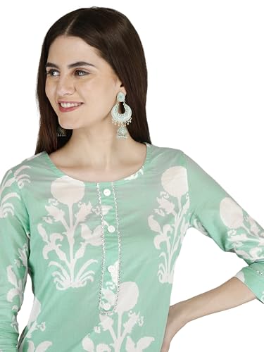 More information about Women's Cotton Printed Kurta Set - Elegant Green Floral Print with 3/4th Sleeves, Festive Wear.