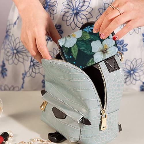 White Hibiscus Flower and Leaves Pattern Credit Card Holder Case Leather Printed Zipper ID Card Case Wallet Small RIFD Blocking Wallet for Women Girls 5